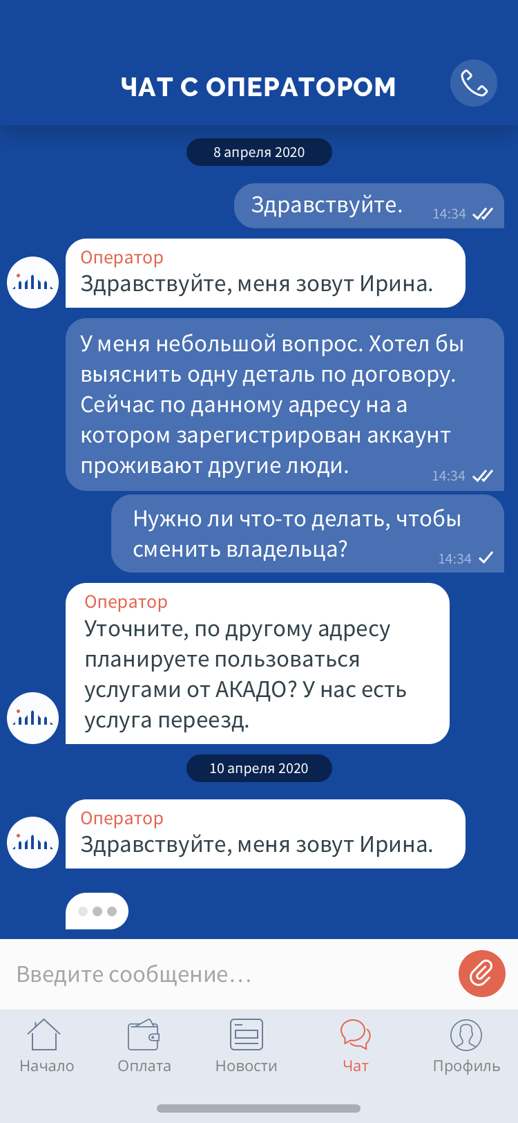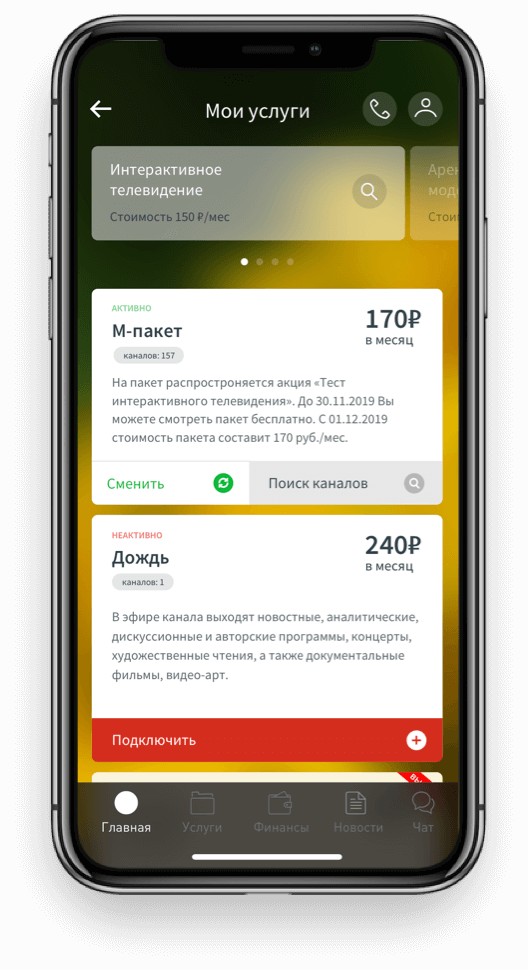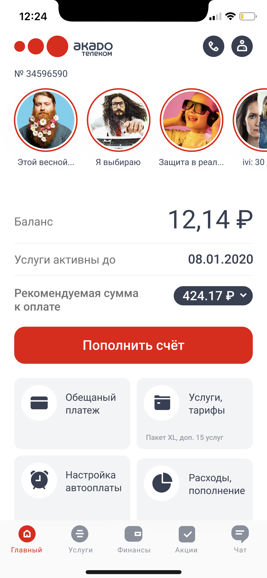Интернет-провайдер "Акадо Телеком"Мобильное приложение (разделы: старт, финансы, каталог услуг, call-центр, прочее)