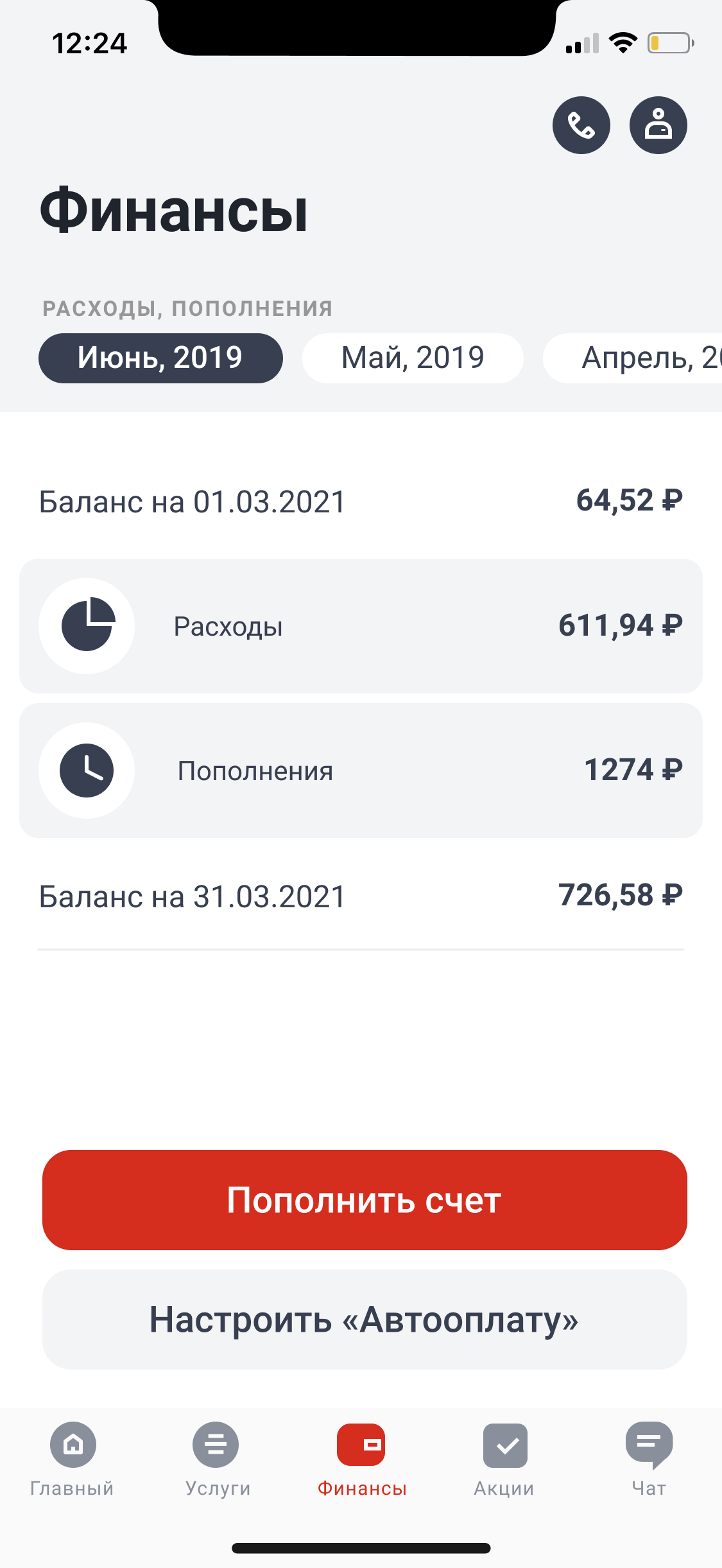 Быстрый доступ к основным возможностям приложения: пополнения баланса, обещанный платеж, каталог услуг, автооплата, информация о расходах и пополнениях