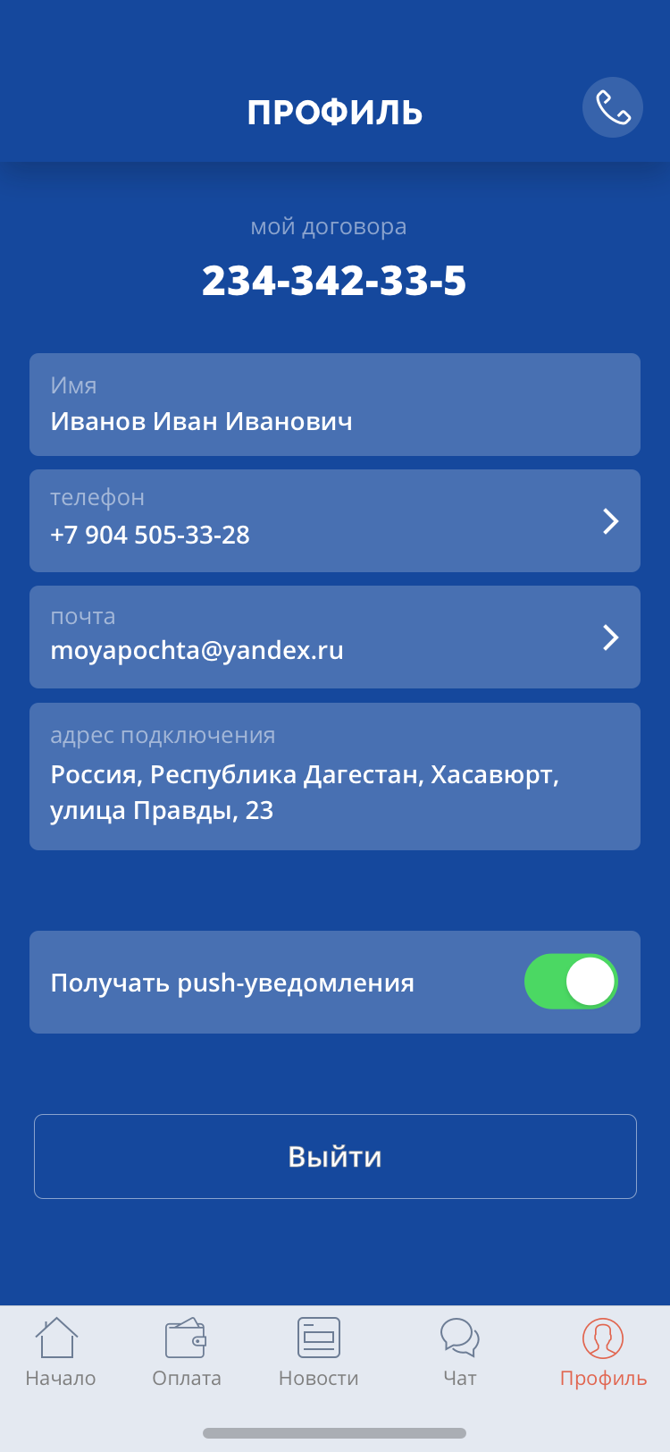 Информация о пользователе: номер договора, фио, контактные данные (email, телефон, адрес подключения)